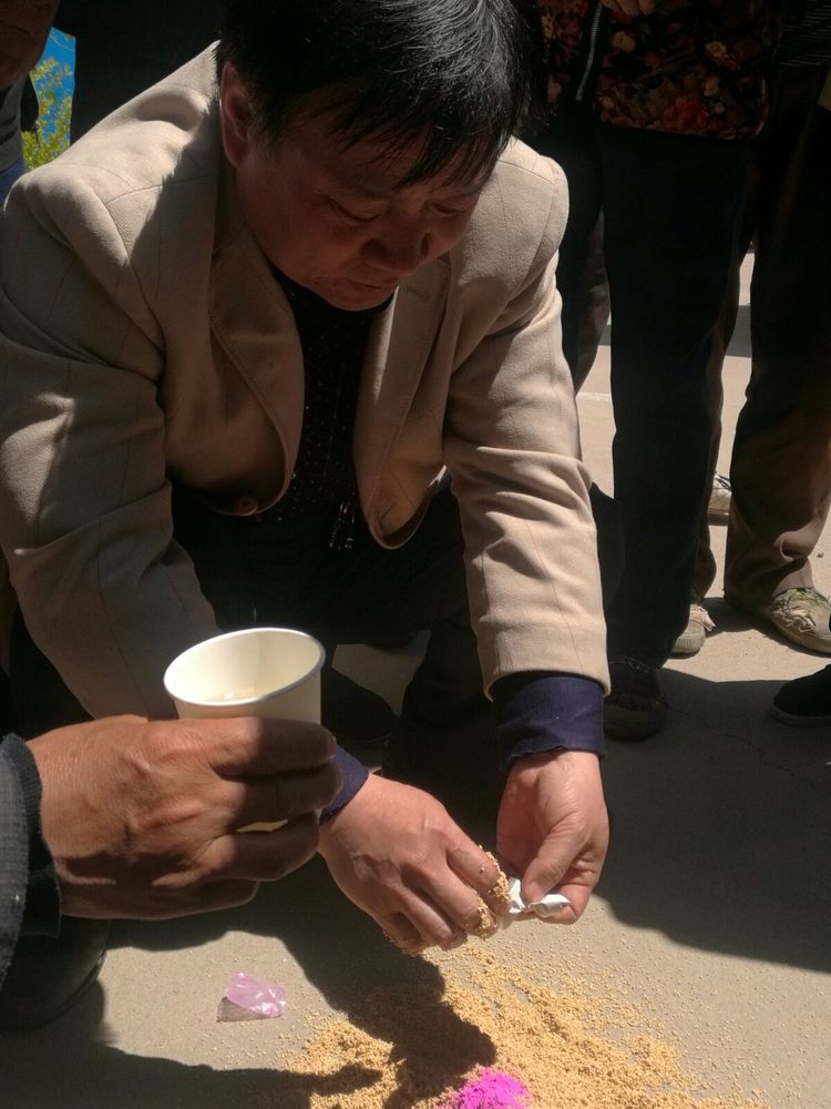 專家為農(nóng)戶現(xiàn)場進行拌種技術(shù)示范指導